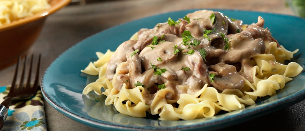 3. To the same pan, add the onion and mushrooms. Sauté for about 10 minutes, until onions are soft and the mushrooms are slightly browned. Add the beef broth to the pan and bring to a simmer. In a small bowl, mix together cornstarch with 1 tablespoon of water. Add the slurry to the stock and stir to combine. Add the peas and sour cream to the sauce and stir to combine.