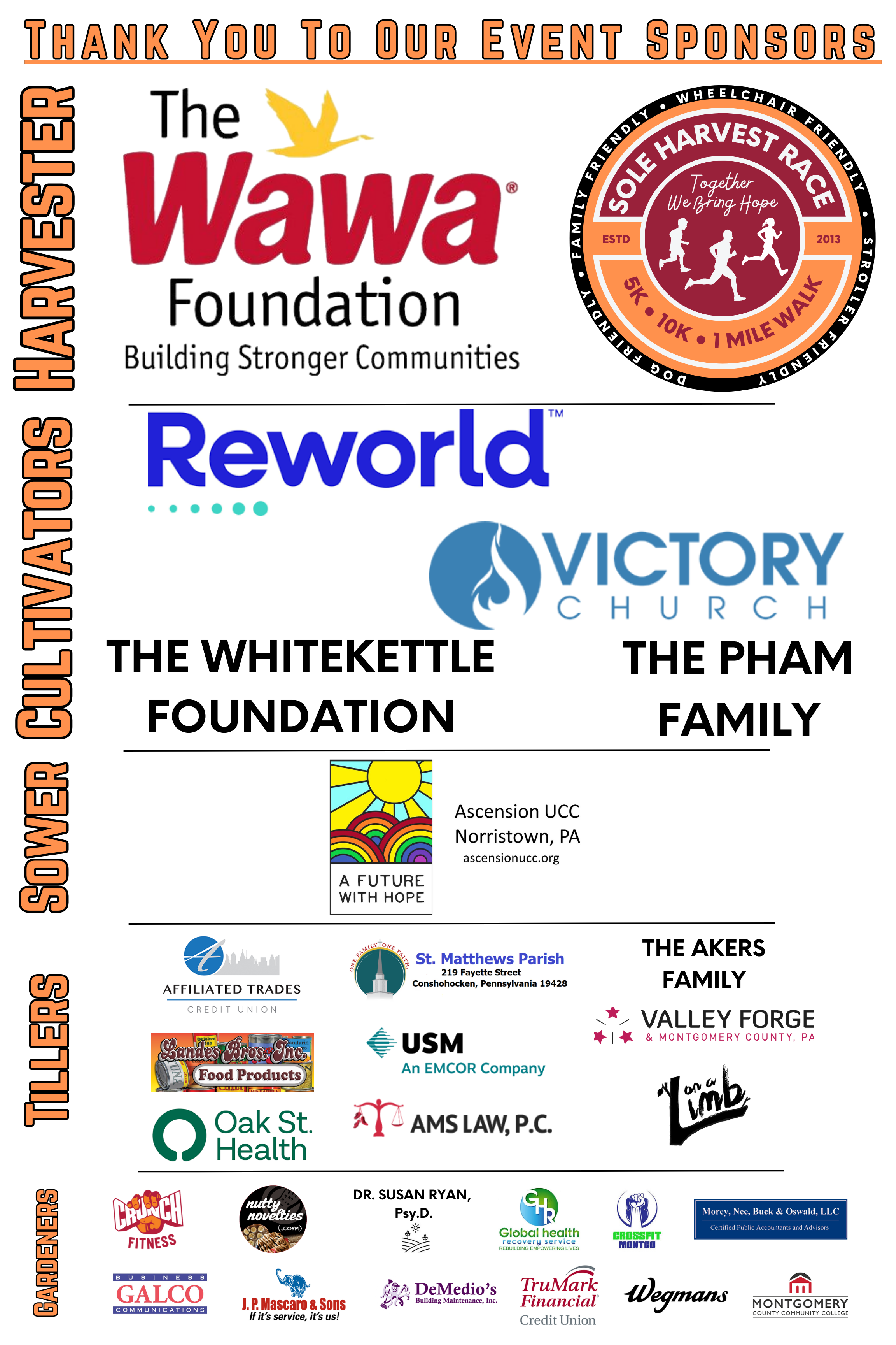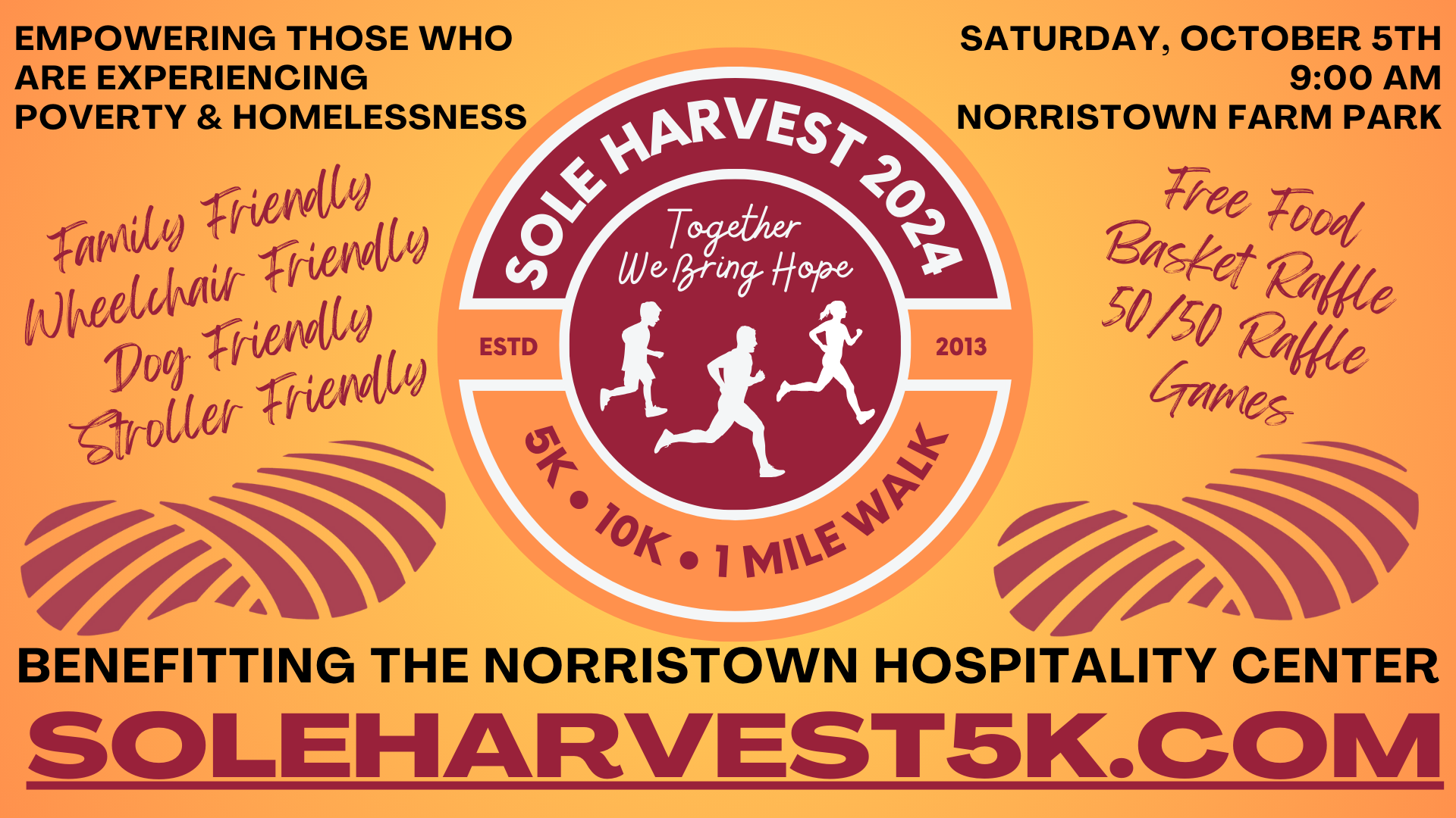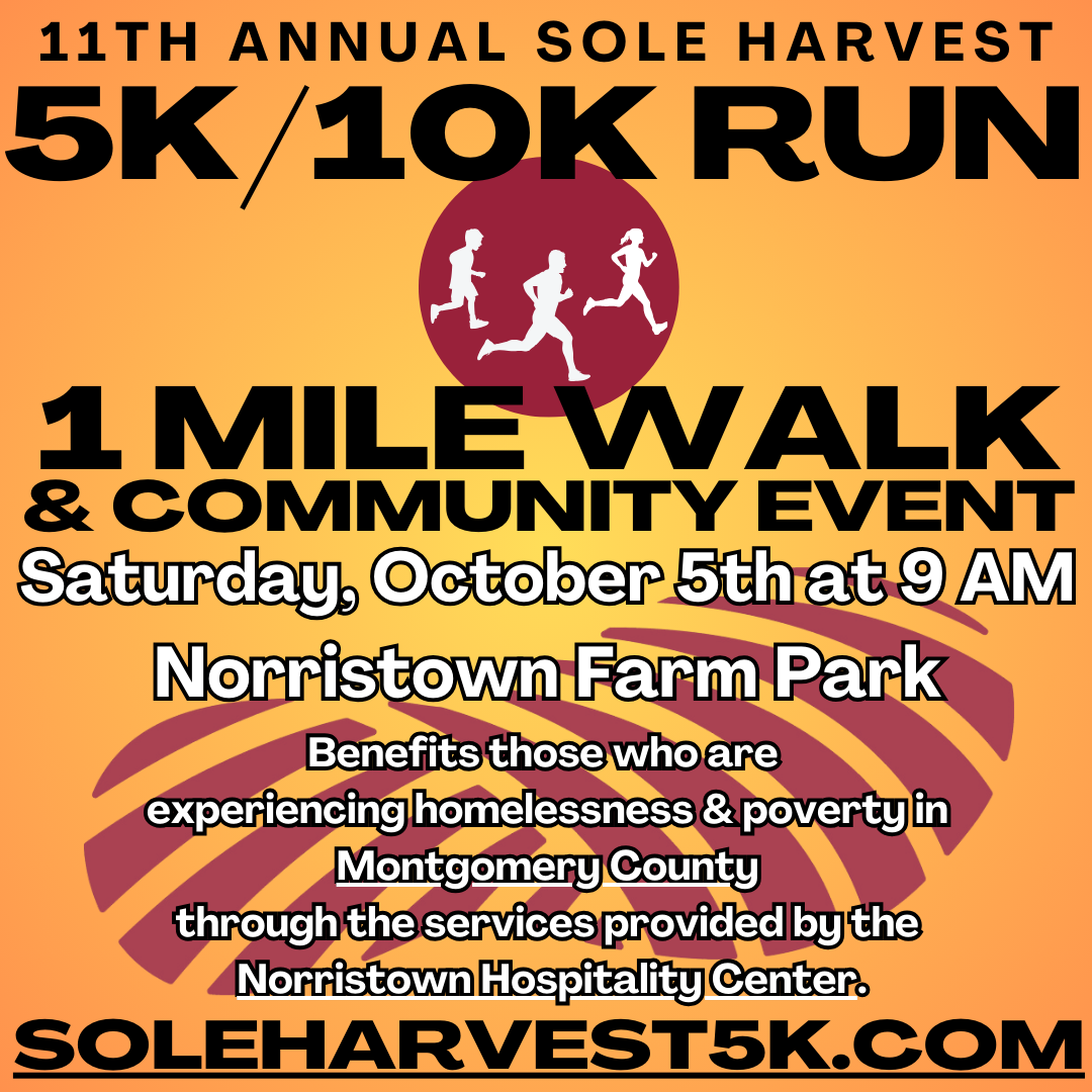 We’re thrilled to announce the return of the Sole Harvest…now in it’s 11th year! This year, we’re offering a 5K, 10K, 1-Mile Walk, and a fun Community Event – all to support the incredible Norristown Hospitality Center. Whether you’re a seasoned runner, a casual walker, or just looking for a day of community spirit, we have something for everyone!