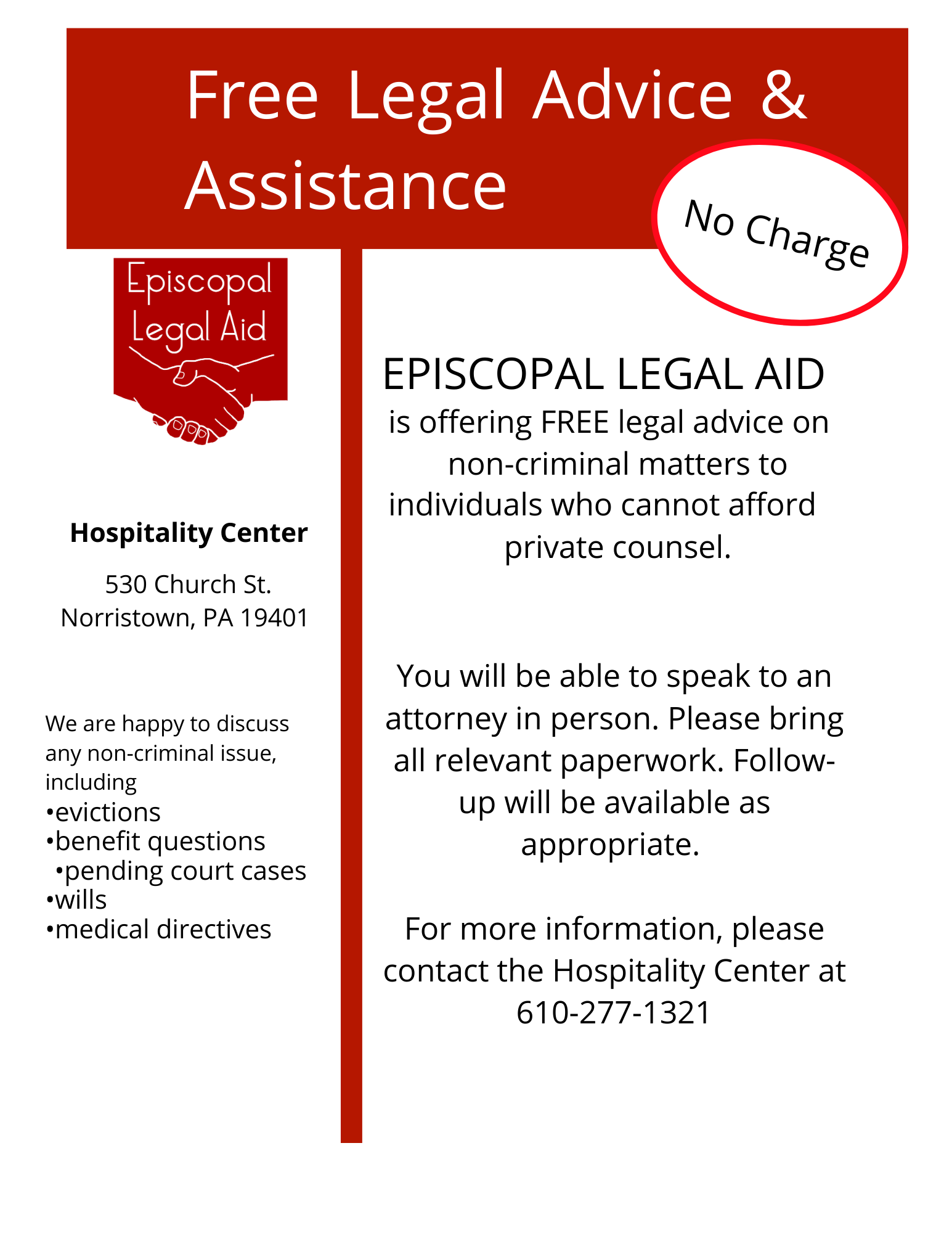 Free Legal Help Available: Struggling with a legal issue? The Norristown Hospitality Center offers two legal clinics each month in partnership with both Episcopal Legal Aid and Legal Aid of Southeastern Pennsylvania. Both clinics offer free legal services to people in need in the Norristown area.