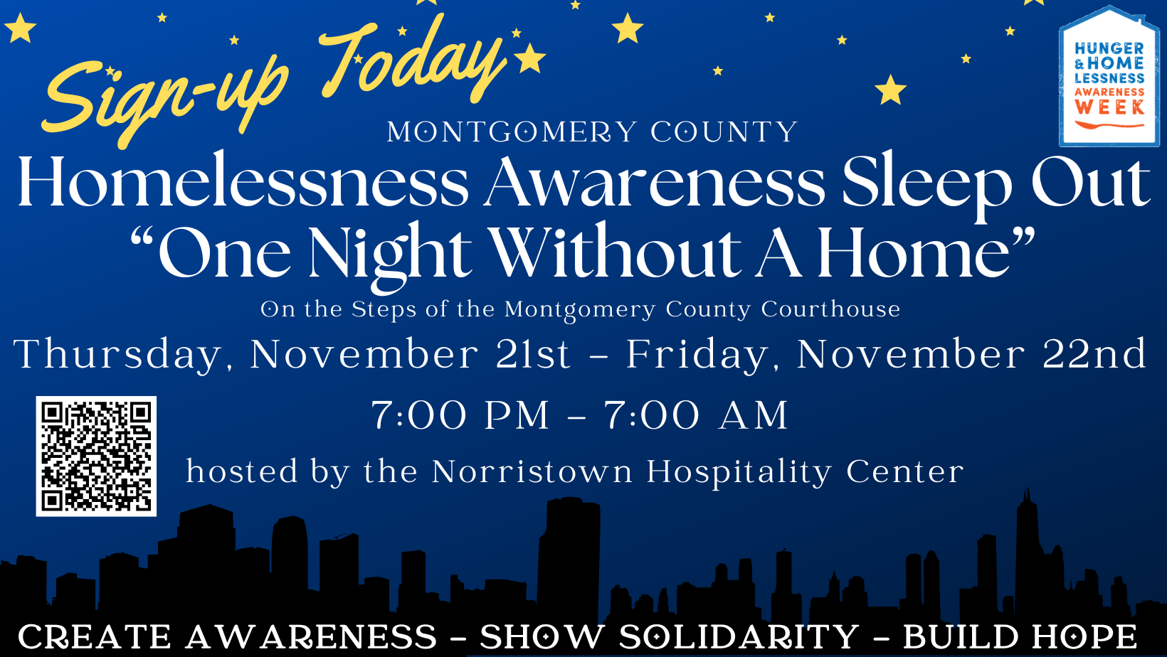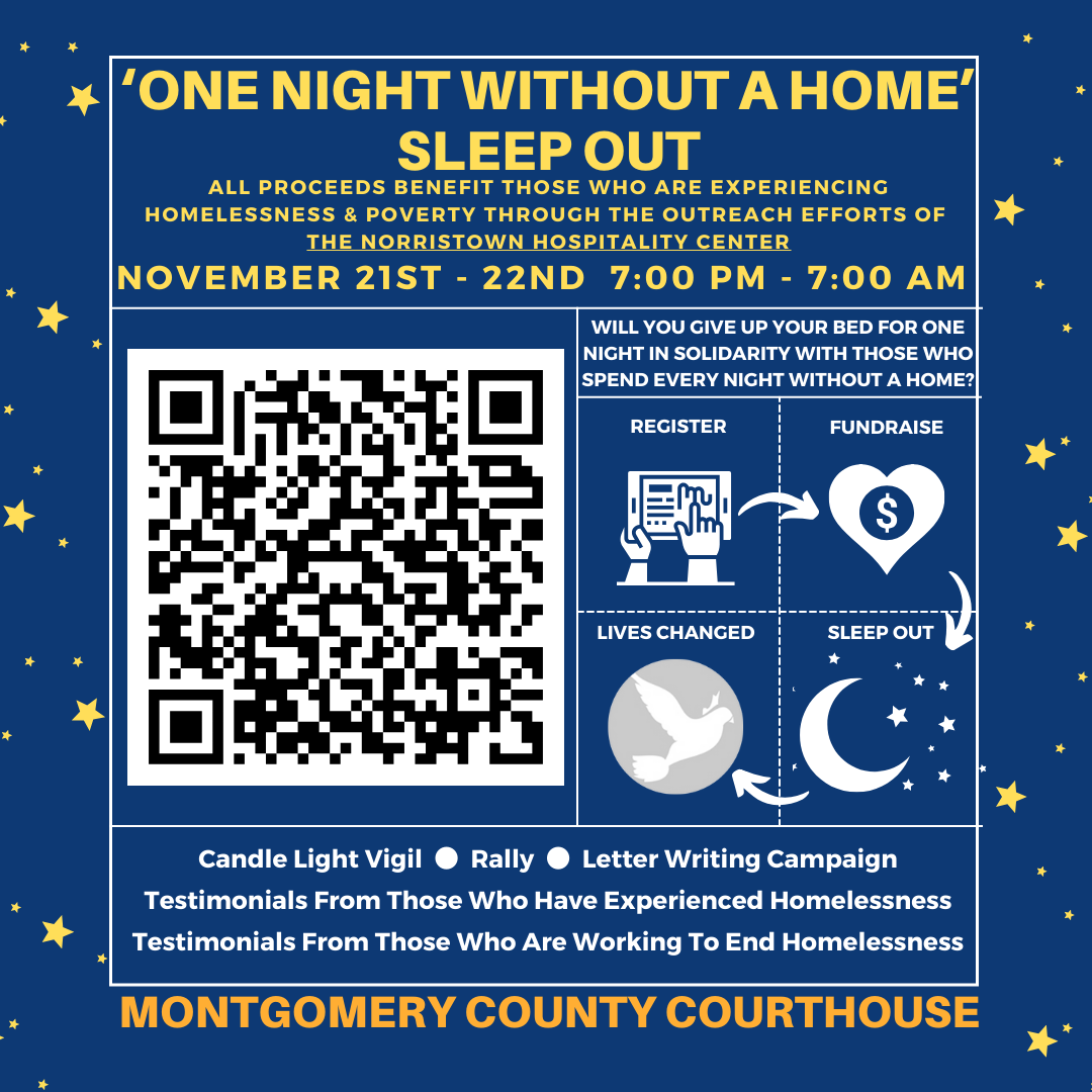 The “One Night Without a Home” Sleep Out is an opportunity to show support for our neighbors who live on the street. There will be a rally, speakers, a prayer vigil, and a solidarity sleep-out. We will join together to create awareness and, through our peer-to-peer fundraising campaign, raise money that will directly impact Norristown area homeless population.